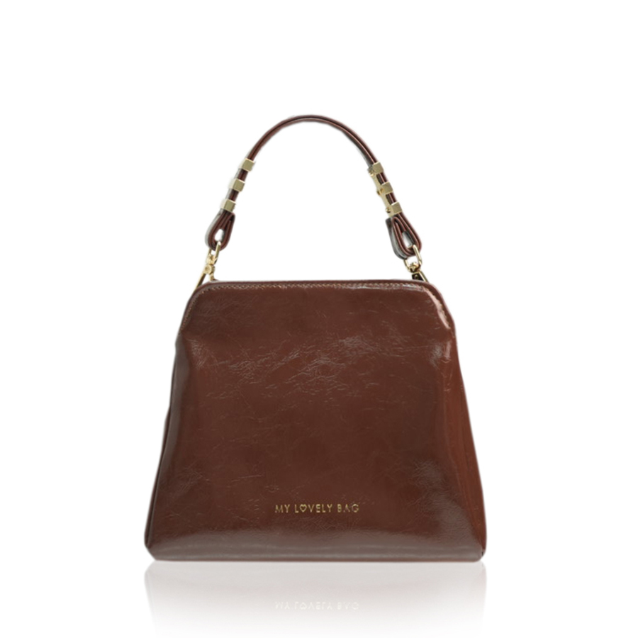 Blago trapezasta torbica s ručkicom ukrašenom zlatnim detaljima i kopčanjem na skrivene magnete.